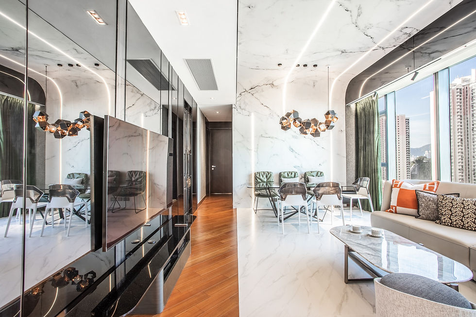 The materials used in this design include light-coloured stone-like wallpaper, curly ceilings in various spaces, and a customised leather sofa with detail touches. These materials offer a sense of warmth and elegance to the space. The use of wood-panelled walls and sleek wood flooring adds to the warm ambiance of the home.