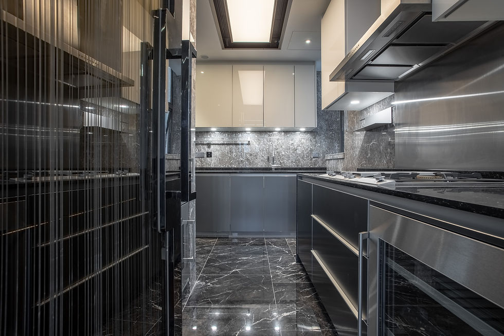 The use of curly ceilings in various spaces, from the sitting area to the bedrooms, adds a unique touch of character and charm to the home. The customised leather sofa with detail touches brings a sense of luxury and sophistication to the living room. The light-coloured stone-like wallpaper creates a sense of continuity throughout the home.